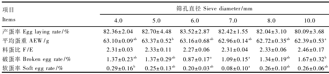 通过对2592只210日龄的海兰褐蛋鸡,为期 16 周试验。饲料原料使用锤片式粉碎机进行粉碎,其中玉米分别用 4.0、5.0、6.0、7.0、8.0和10.0mm 的筛孔直径进行粉碎,其它饲料原料均采用5.0mm 的筛孔直径进行粉碎。